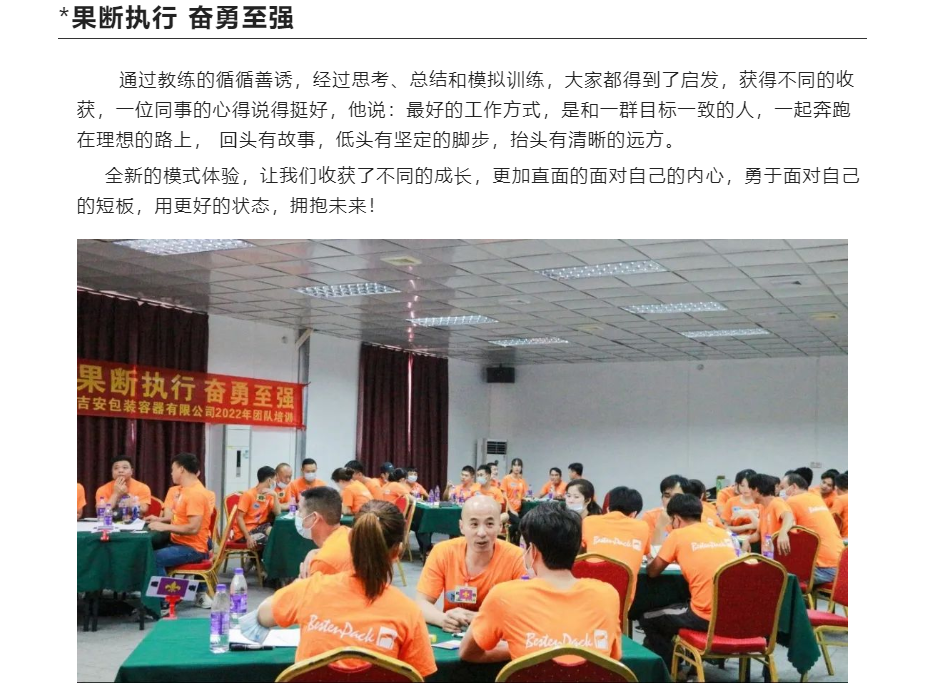 吉安容器2022年度團(tuán)隊(duì)培訓(xùn)如期舉行,前幾次的培訓(xùn)重點(diǎn)是在“拓展”項(xiàng)目中通過挑戰(zhàn)和趣味性游戲的方式,讓團(tuán)隊(duì)更加直觀的面對問題,三和團(tuán)建根據(jù)每一次的培訓(xùn)情況,制定科學(xué)方案,拓展項(xiàng)目更多的重點(diǎn)在于如何提高團(tuán)隊(duì)的凝聚力,而今年我們開啟了全新的模式,通過《沙盤模擬課程》,啟發(fā)大家的全新思維模式,實(shí)現(xiàn)如何有效溝通,如果實(shí)現(xiàn)跨橋梁對接。